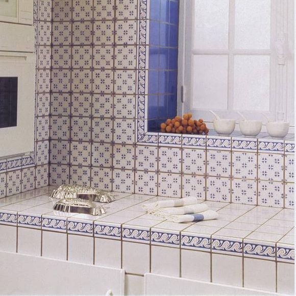 1. Carreaux « Les Majoliques » : Oiseaux bleus 5252 / Paniers bleus 5254 / Semis 5256 – Listel : Outremer 5156 – Plan de travail en grès émaillé : Désert 5025