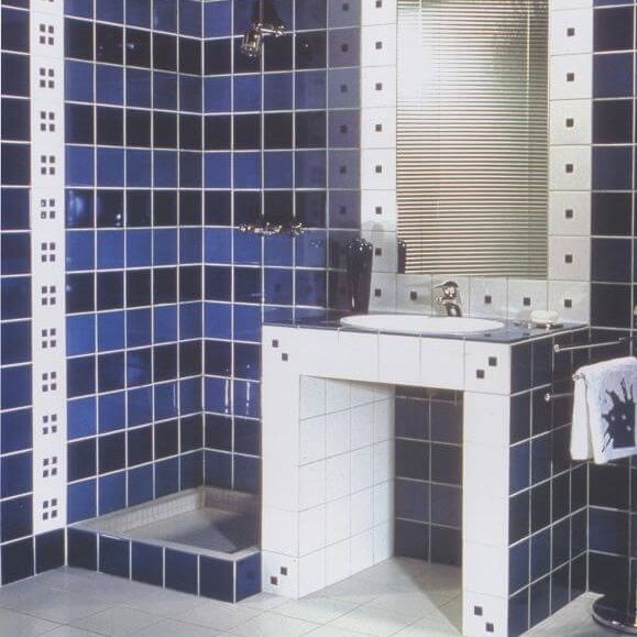 1. Carreaux en grès émaillé : Uni Blanc 3866 / Carré Bleu 3891 – Angle : Broderie Bleue 3894 – Profil : bord rond Blanc 3854 – Frise : Broderie Bleue 3893